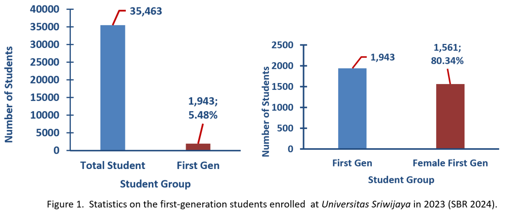 As of 2023, only about 5.48% (1,943 students) of all students of Universitas Sriwijaya (35,463 students) were identified as first-generation students. Referring to this proportion, this group was not significant compared to the total number of Universitas Sriwijaya students starting degree in 2023, which were 35,463 students.