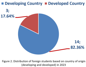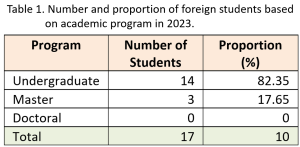 In 2023, there were a total of 17 foreign students. As compared to the total number of students enrolling in 2023 (Figure 1), the proportion of foreign students at Universitas Sriwijaya was still low, less than 1%. In order to boost the number of international students in the future, aid programs like scholarships, tuition fee waivers, and free on-campus housing are being prepared.