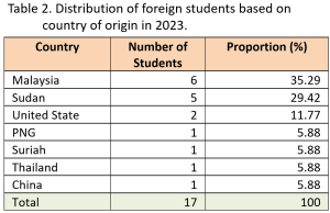 The nation of origin of Universitas Sriwijaya‘s international students is shown in Table 2. They are dominated by students from 2 countries, namely Malaysia (35.29%) and Sudan (29.42%).