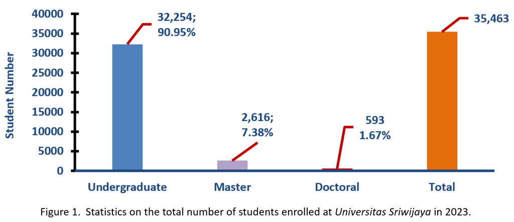 Figure 1 shows the statistics of students enrolled at Universitas Sriwijaya. The total number of students in 2023 was 35,463, including 32,254 Undergraduate students, 2,616 Master students, and 593 Doctoral students.