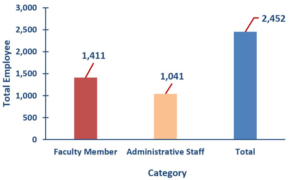 Figure 1 shows the statistics of total active faculty members and administrative staffs of Universitas Sriwijaya.  Overall, there were 2,452 employees at Universitas Sriwijaya in 2023, comprising of 1,411 faculty members and 1,041 administrative staffs.