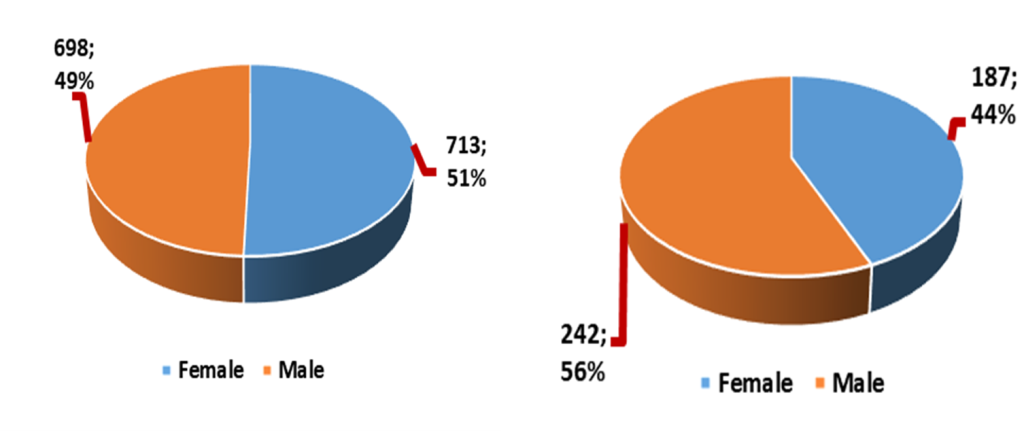 As described in 10.5 that Universitas Sriwijaya employed 2,452 people in 2023, including 1,411 faculty members and 1,041 administrative staffs. It’s worth noting that there were more female faculty members (51%) than male faculty members (49%), which is a positive step towards gender equality in academia. However, there were fewer female administrative staffs (38%) compared to male staffs (62%). This data provides insight into the current demographics of the university and may guide future efforts towards achieving greater gender balance in all roles, as shown in Figure 2.