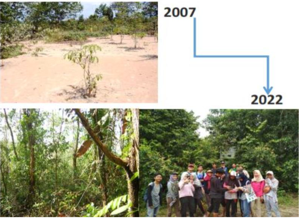 The natural forest area includes an arboretum spanning approximately 5 hectares, established in 2007 with support from the South Sumatra Forest Fire Management Project (SSFFMP). This initiative was part of a technical cooperation project jointly funded by the European Commission and the Government of Indonesia through the Ministry of Forestry. During the development of the arboretum, invasive Acacia mangium seedlings were manually removed, either by pulling them out or cutting them at the soil surface. For larger trees that could not be removed physically, a ring-barking or girdling technique was applied, involving the removal of a 25–30 cm wide ring of bark. Native tree species were preserved and left undisturbed, including significant species such as Alstonia scholaris, Peronema canescens, Schima wallichii, Fagraea fragrans, Melaleuca leucadendra, and Parkia speciosa.