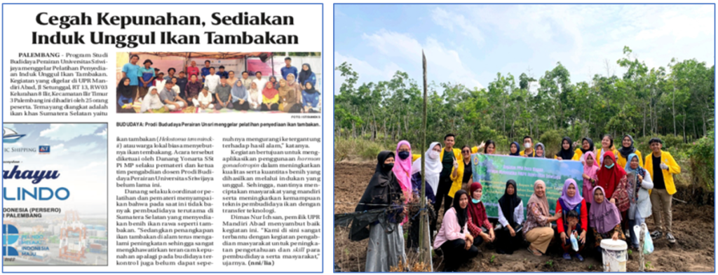 Various research outcomes from Universitas Sriwijaya are implemented within the broader community, especially in Fostered Villages. For example, in the agricultural sector, assistance is provided for implementing vegetable fertilization using Eco Enzyme with a balance of ingredients based on simple mathematical patterns in Pulau Semambu Village, Indralaya. In the fisheries sector, support is provided for the production of “Tambakan” fish, a local fish species from South Sumatra that can be cultivated as a source of income for fish-farming communities.